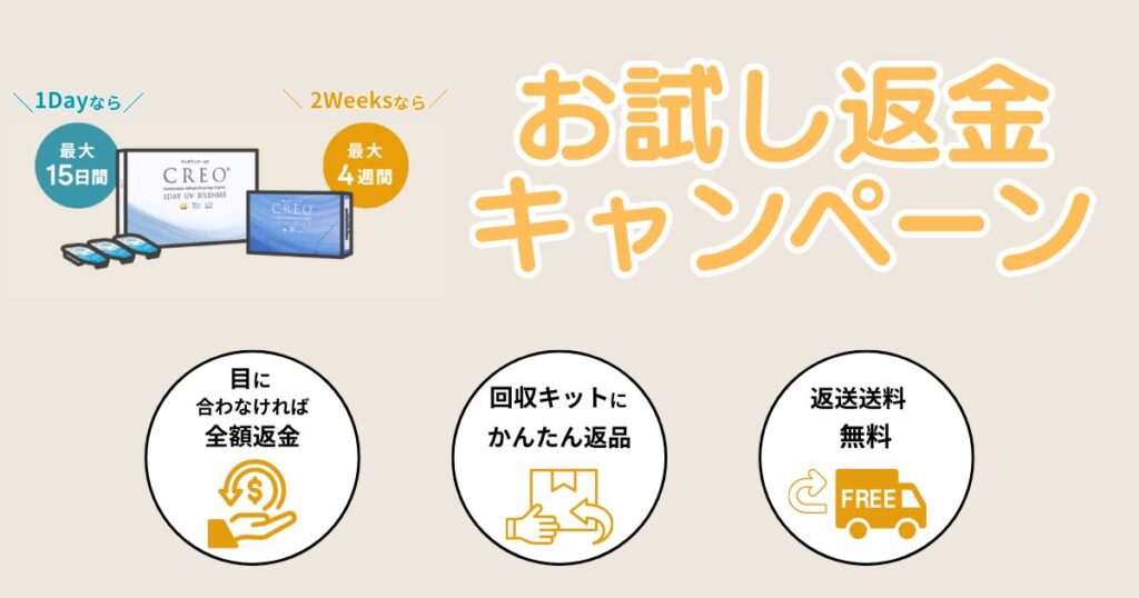 お試し返金キャンペーンの対象なら、使用後でも返金返品(返送無料)してもらえるので気になるコンタクトを試しやすい◎